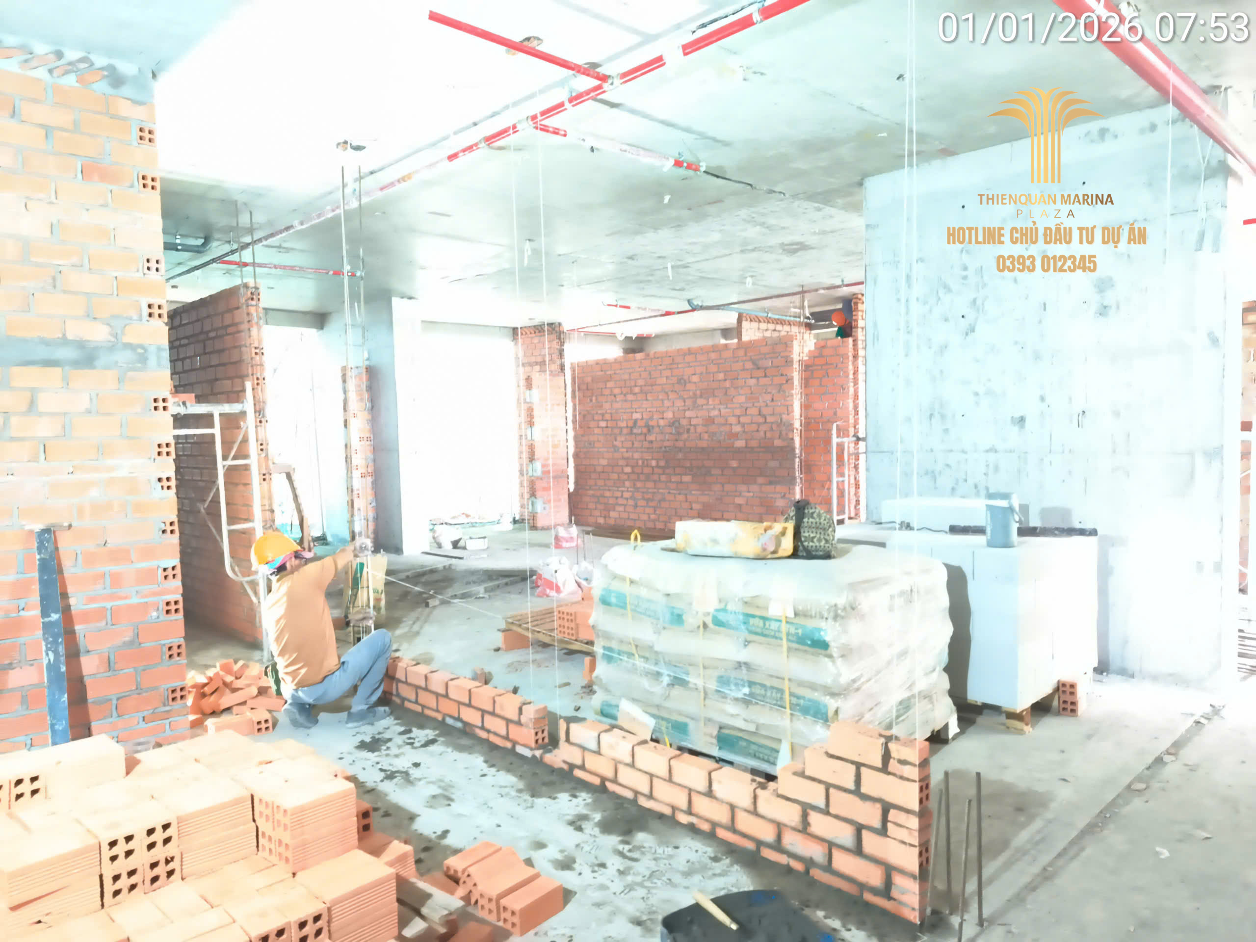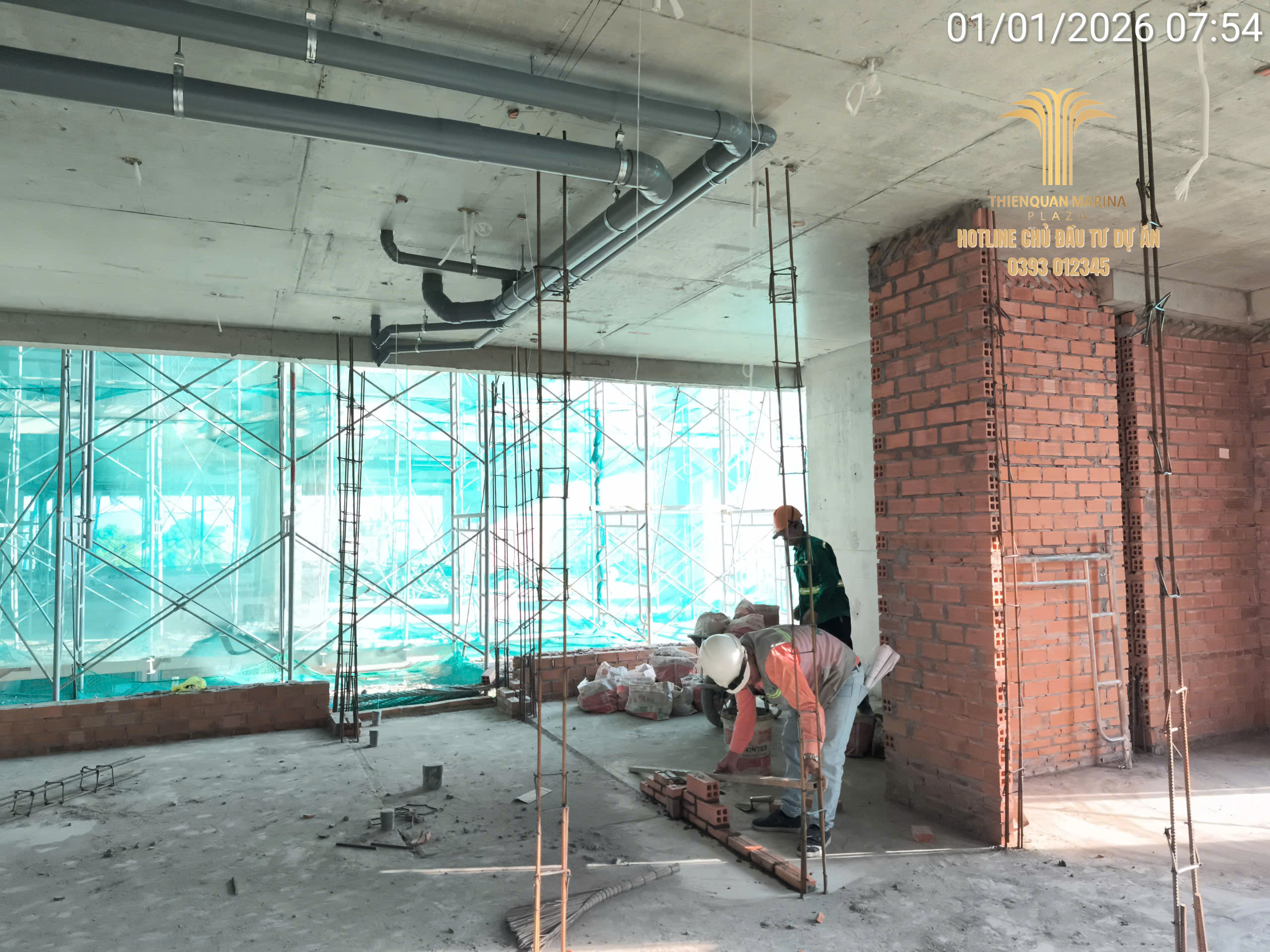 Ngày 01/01/2026, trong không khí phấn khởi của ngày đầu năm mới, công trường Thiên Quân Marina Plaza vẫn duy trì nhịp độ thi công sôi nổi. Với sự hỗ trợ của thời tiết nắng ráo cả ngày, đội ngũ kỹ sư và công nhân đang tập trung cao độ cho các hạng mục kết cấu tại Tầng 19 và khu vực khối đế.