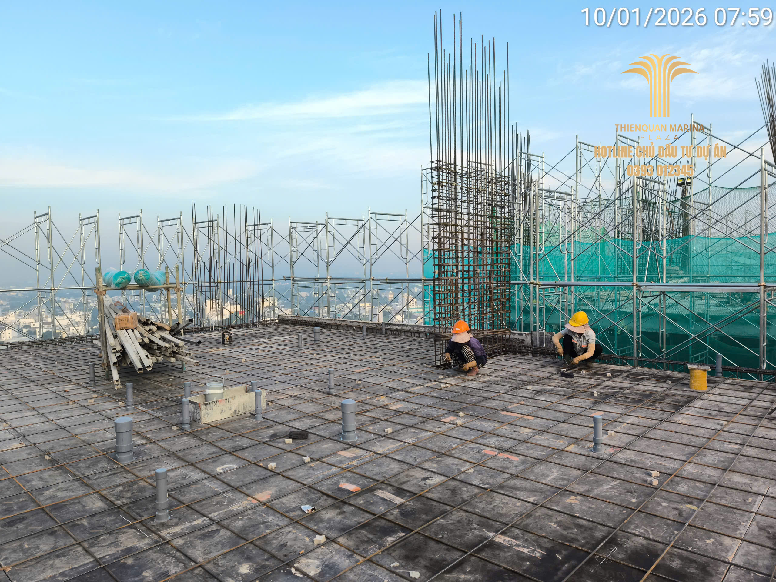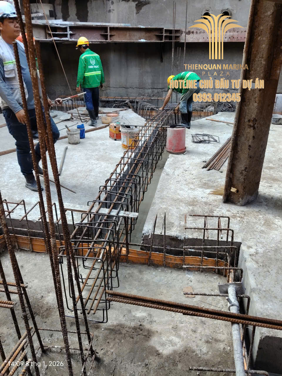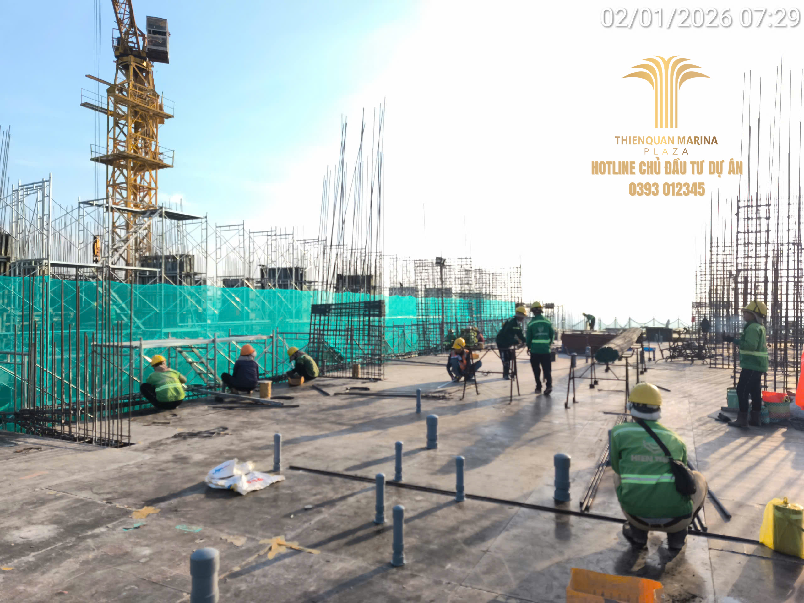Khép lại tuần làm việc đầy nỗ lực, công trường Thiên Quân Marina Plaza ngày 11/01/2026 tiếp tục duy trì nhịp độ khẩn trương. Với tinh thần quyết tâm cao, Ban chỉ huy cùng đội ngũ công nhân đang tập trung tối đa cho các hạng mục kết cấu tầng cao và hoàn thiện hạ tầng khối nhà 5 tầng.
