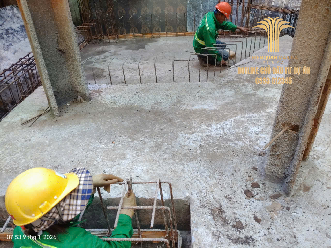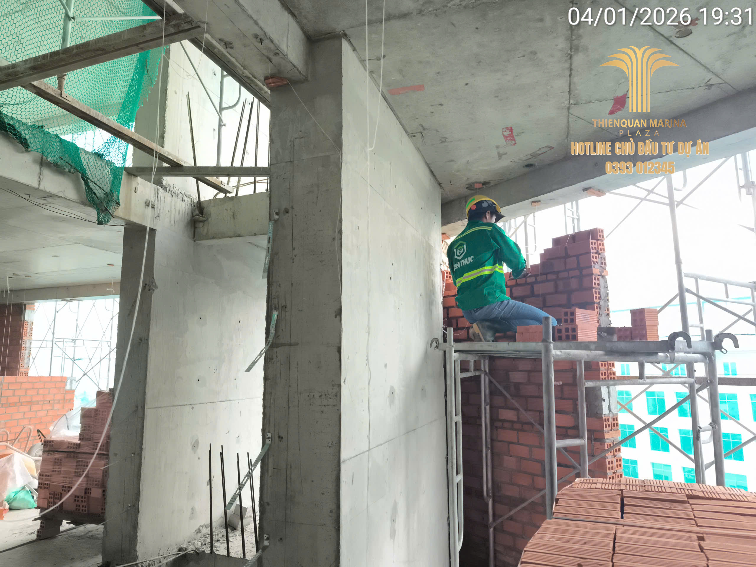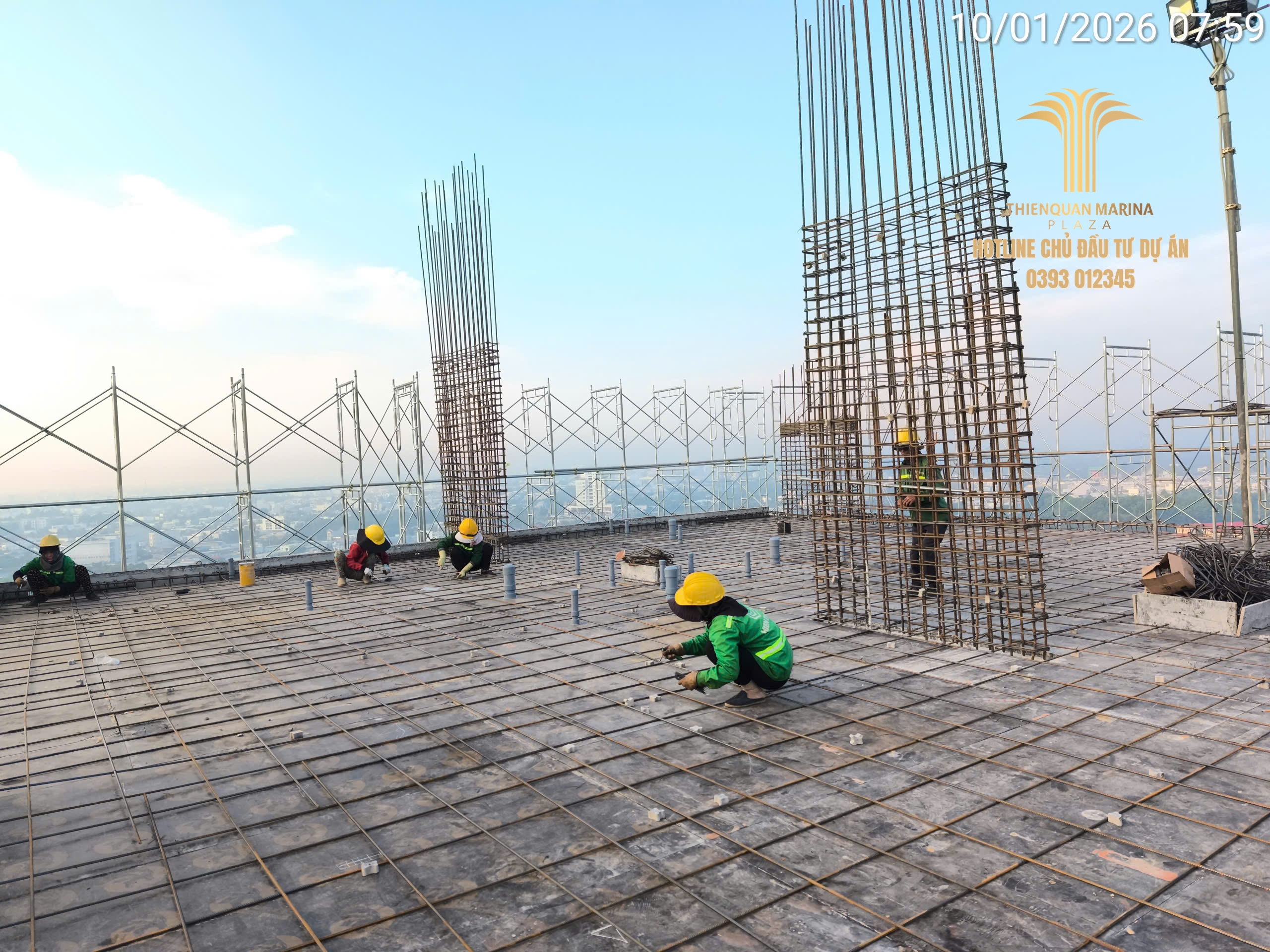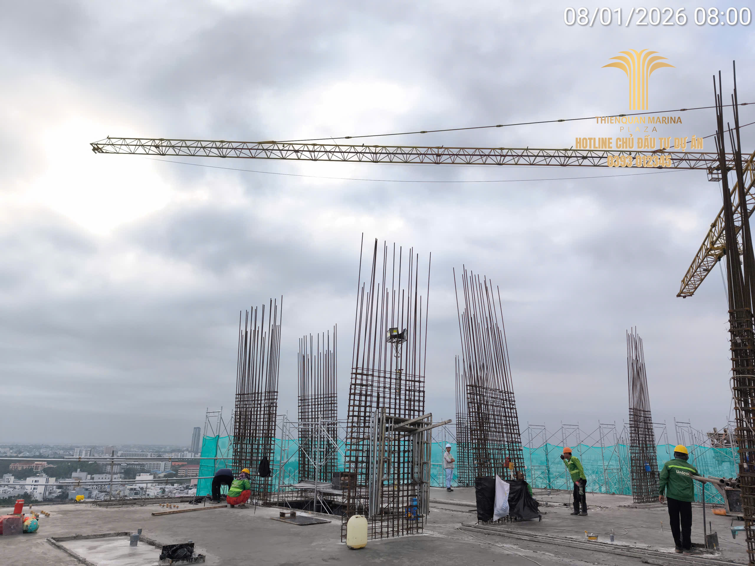 Khép lại tuần làm việc đầy nỗ lực, công trường Thiên Quân Marina Plaza ngày 11/01/2026 tiếp tục duy trì nhịp độ khẩn trương. Với tinh thần quyết tâm cao, Ban chỉ huy cùng đội ngũ công nhân đang tập trung tối đa cho các hạng mục kết cấu tầng cao và hoàn thiện hạ tầng khối nhà 5 tầng.