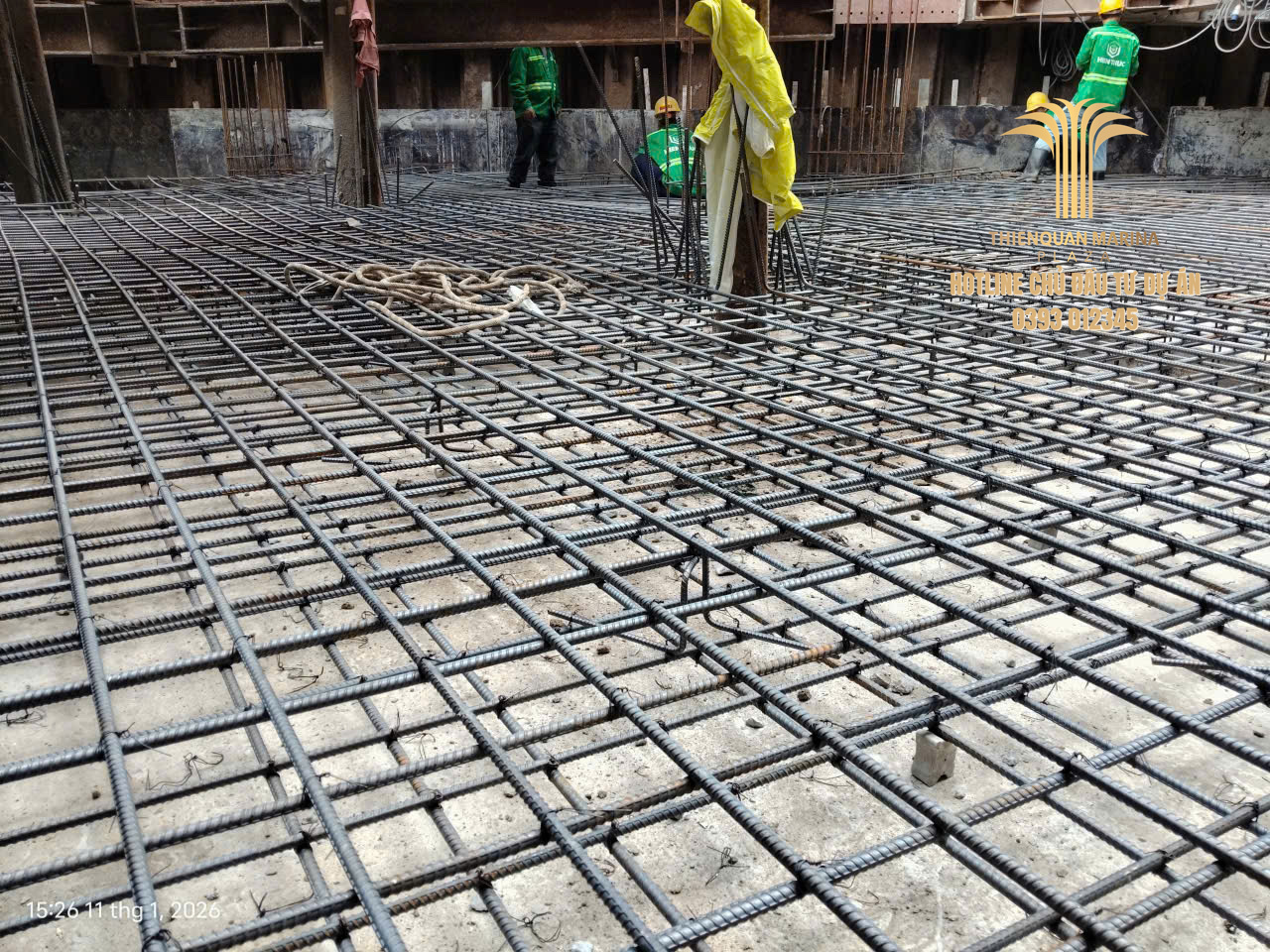 Hạ tầng: Gia công, lắp dựng thép giằng móng và thép sàn hầm B1 khu vực 5 tầng.
